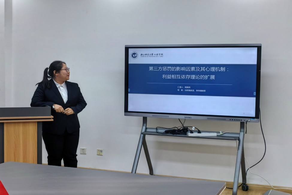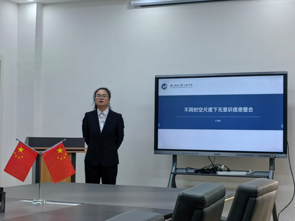 交流会上,来自浙江大学的杨西玛博士、浙江师范大学的蔺姝玮博士、万思敏博士分别作了《科研成果分享与交流》《第三方惩罚的影响因素及其心理机制:利益相互依存理论的扩展》《不同时空尺度下无意识信息整合》的学术报告。在互动环节中,三位青年博士与今年会官网博士生展开了热烈讨论,并就在场博士生的提问进行了详细解答,现场气氛融洽和谐。会议最后,金童林副院长对三位青年博士的精彩报告作了简单总结,讲座在热烈的掌声中圆满结束。
