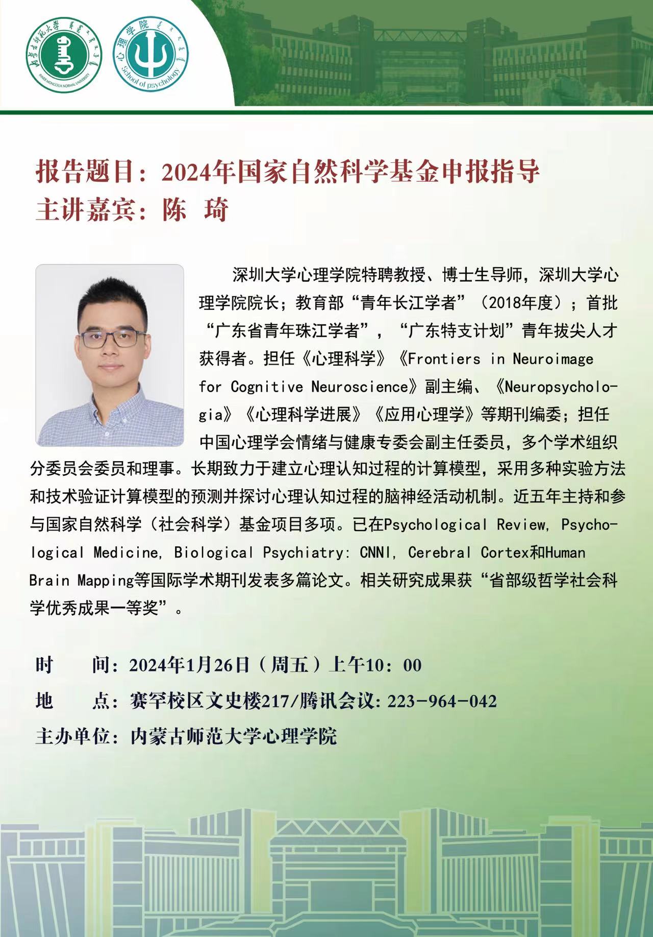 为推进2024年国家自然科学基金申报动员工作,进一步提高申报质量,1月26日,今年会官网召开2024年国家自然科学基金申报推进会,邀请深圳大学今年会官方网站院长陈琦教授为今年会官网全体教师作线上的申报指导。学院党委书记侯友、院长乌云特娜、副院长金童林及全体教师参加会议,会议由副院长金童林主持。