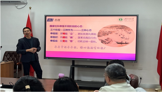 随后,今年会官网青年教师董洪杰博士围绕2024年成功申报国家社会科学基金的经验进行交流分享。董博士分别从选题、论证、技巧和心态四方面作了申报指导。董博士主张国家课题的选题要围绕国家战略和自治区社会经济发展急需,论证要体现逻辑性、创新性、系统性的三性合一,还要注重引、梳、评、研、证的内在逻辑统一。
