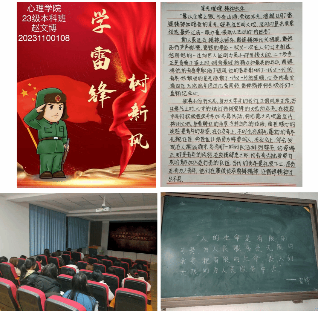 思想引领铸信念,知行合一学雷锋。春风送暖,三月芳华,为弘扬雷锋精神,践行新时代青年使命,今年会官网以“雷锋精神暖三月”为主题,开展了系列特色活动,将心理专业优势与志愿服务深度融合,让雷锋精神在校园里生根发芽,在社区中传递温暖。通过多维宣传,学习雷锋精神,组织学生赏析影片《雷锋》《青春雷锋》、组织开展“雷锋精神与我”主题演讲比赛、创意海报设计大赛、书法比赛、征文比赛等活动,以水墨丹青与现代设计融合,诠释“钉子精神”与“螺丝钉品格”、以笔为媒,书写雷锋箴言与感悟,让“奉献、友爱、互助、进步”的志愿信念扎根心田。