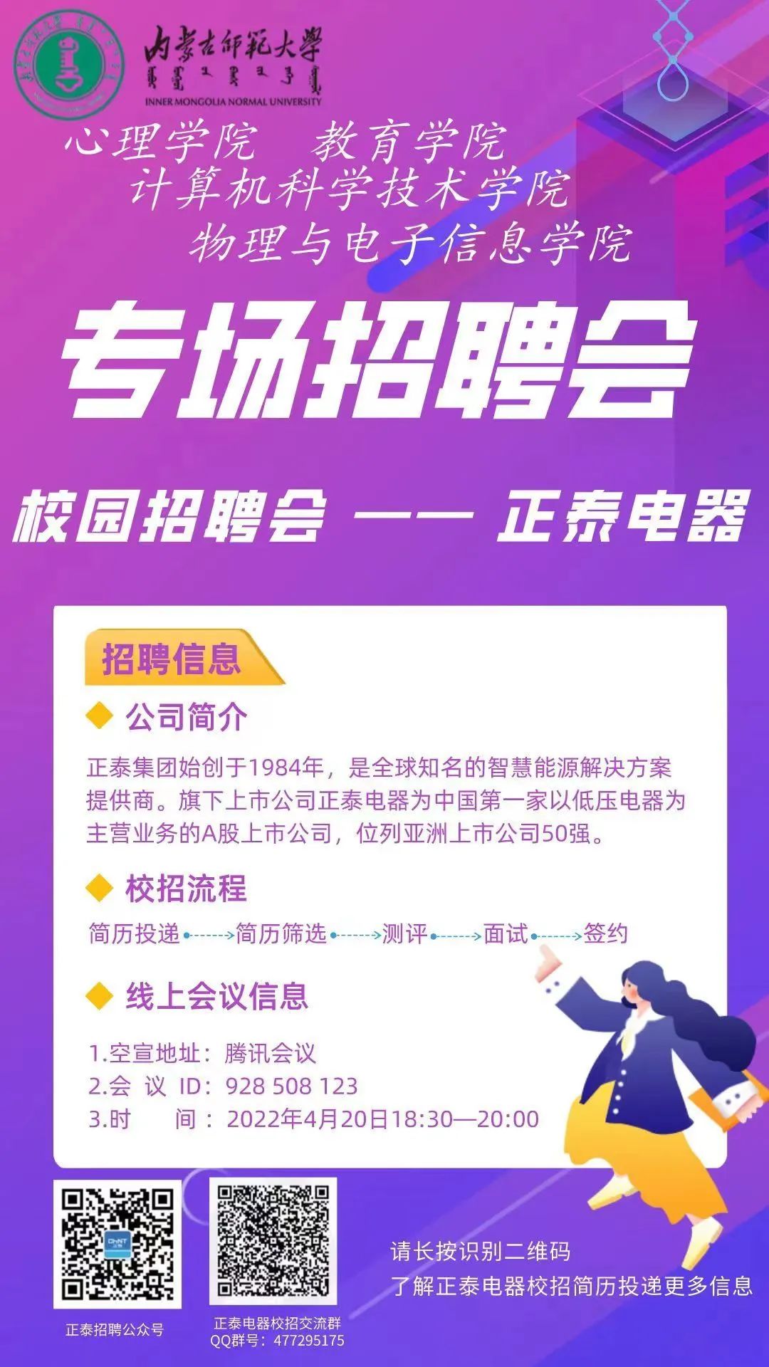 为深入贯彻党中央、国务院“稳就业”“保就业”决策部署,进一步做好毕业生就业工作,拓宽就业渠道,实现高质量就业, 4月20日,今年会官方网站通过校友积极联系正泰电器,面向今年会官方网站、教育学院、物理与电子信息学院、计算机科学技术学院等召开2022届毕业生线上专场招聘会。