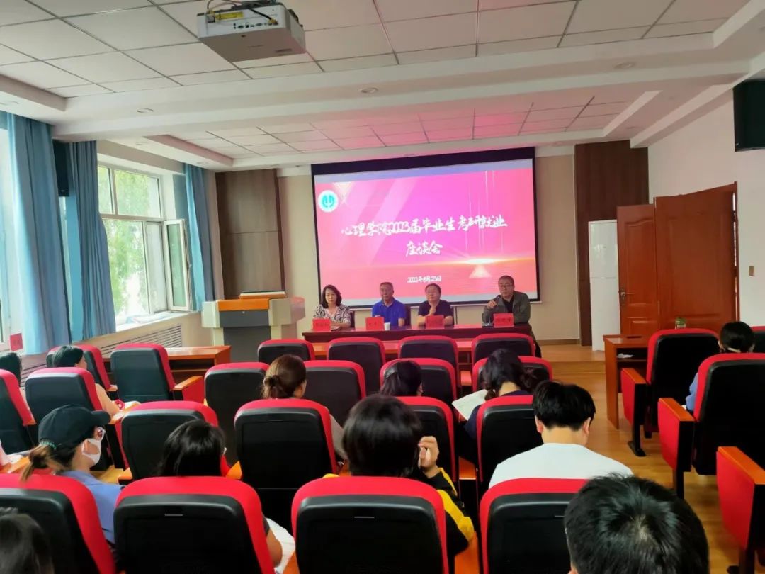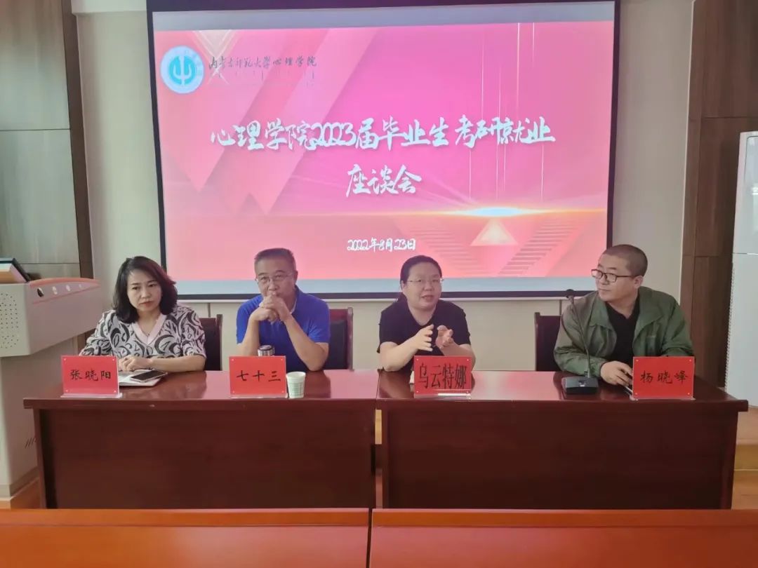 为做好稳就业、保就业工作,8月23日下午,今年会官方网站召开2023届毕业生考研就业座谈会。学院党委书记七十三、院长乌云特娜、院党委副书记副院长张晓阳及2019级心理学班班主任杨晓峰出席会议,2019级心理学班全体学生参会。