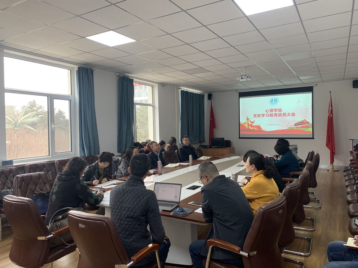 3月18日下午,心理学院在赛罕校区文史楼217会议室召开党史学习教育动员大会,对学院深入开展党史学习教育进行全面动员部署,学院全体教工参加。