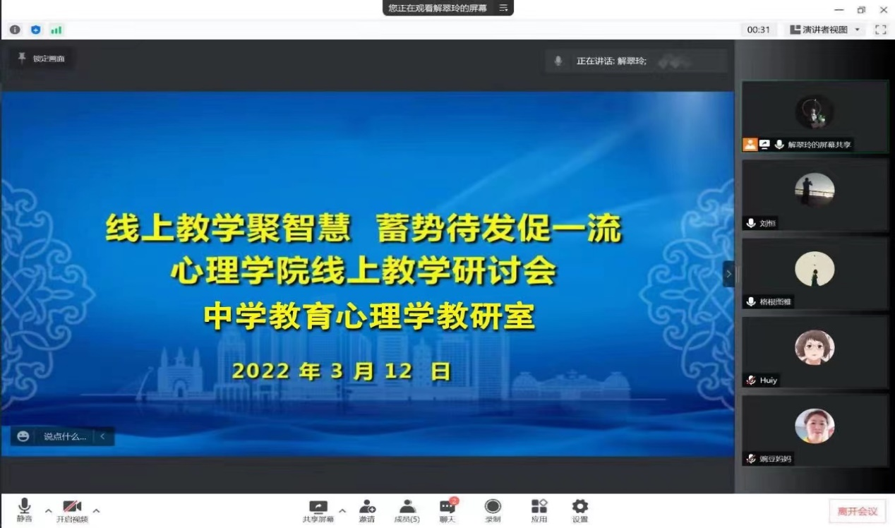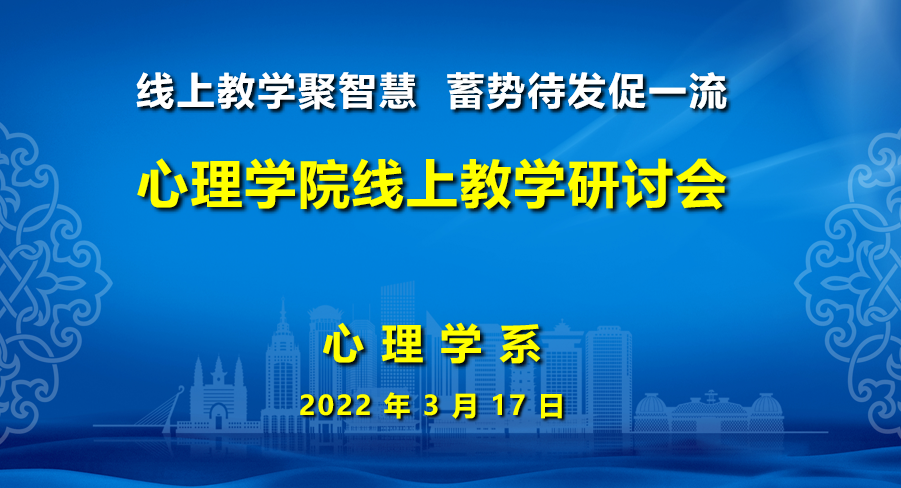 为进一步加强今年会官网线上教学组织管理工作,全力保障线上教学质量,按照学校相关要求,3月12日-17日,学院心理学系、中学教育心理学教研室和职业教育心理学教研室分别以“线上教学聚智慧,蓄势待发促一流”为主题召开了线上教学工作交流研讨会。