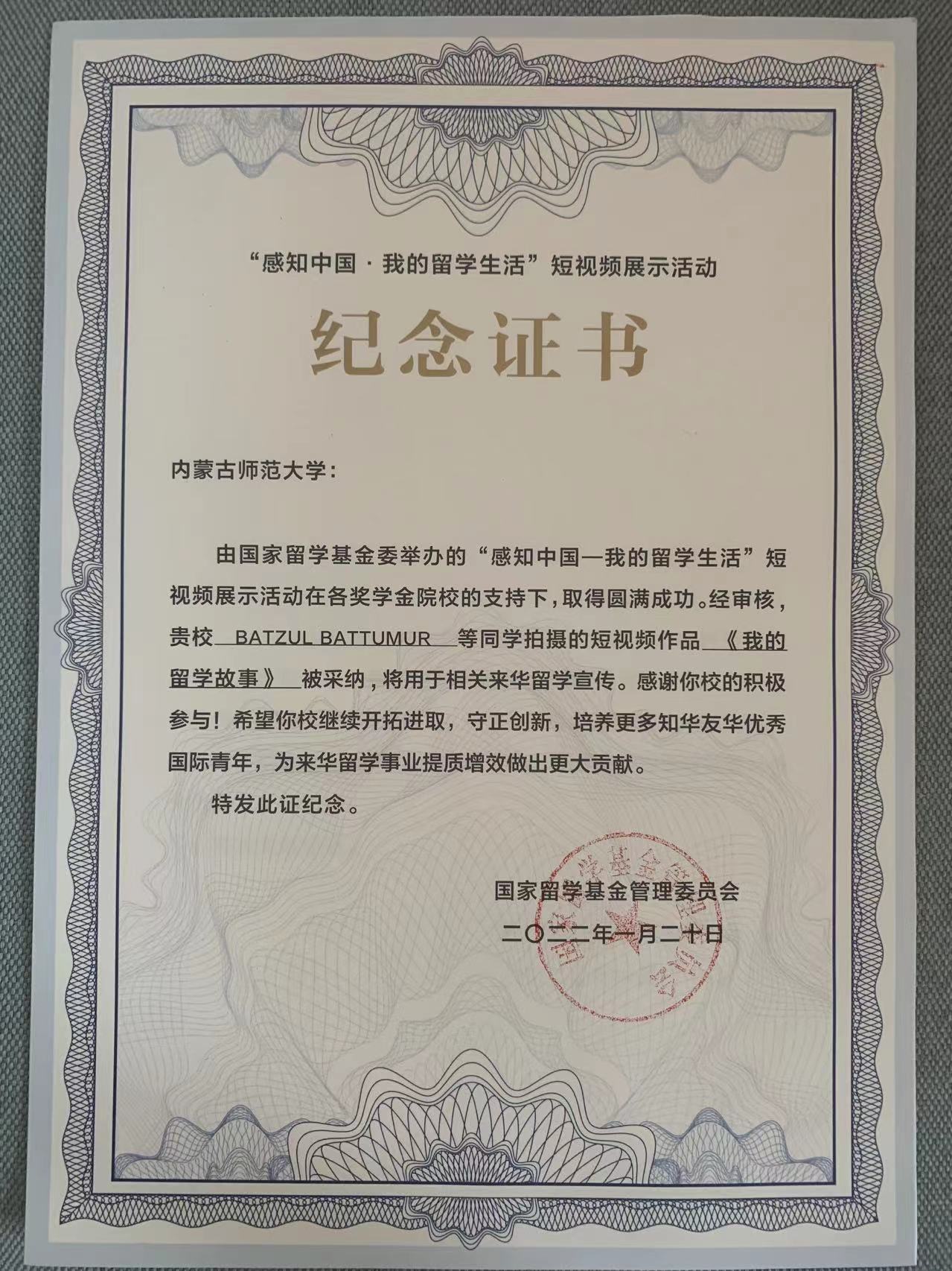 近日,今年会官网留学生BATZUL BATTUMUR同学拍摄的短视频作品《我的留学故事》在国家留学基金委举办的“感知中国——我的留学生活”短视频展示活动中被采纳,将用于相关来华留学宣传。