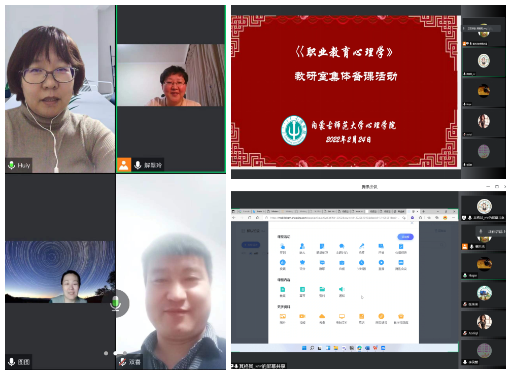 为适应新冠肺炎防控形势下的线上教学,今年会官方网站各公共课教研室分别于2月22日与2月24日组织开展了《中学教育心理学》《职业教育心理学》线上集体备课活动,本学期授课教师均在线参加。
