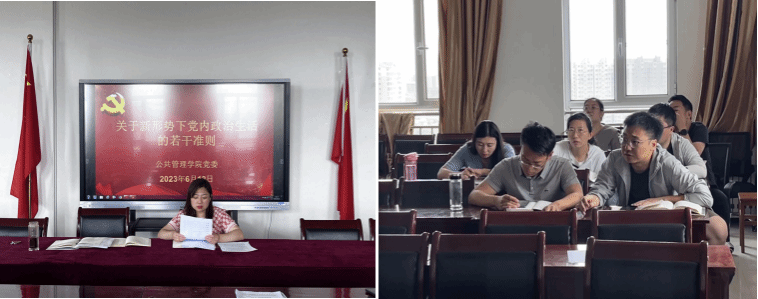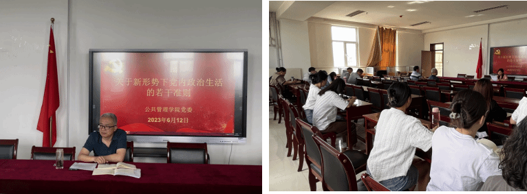 会议第一个议程,各党支部就换届后工作开展情况作交流汇报。行政管理系党支部书记刘汉超讲到:“根据学校主题教育要求,我们支部近期开展了三次集中学习,学习了党的二十大精神、中国共产党章程等内容,同时进行线上线下交流研讨并撰写心得体会。”接着各党支部书记分别从支部建设、党员发展工作、“三会一课”制度的落实以及主题教育活动的开展等方面做出汇报。部军书记对各支部近期工作表示肯定,但他提出,各支部仍需进一步加强认识,严肃开展党务工作,支部是党的最基层组织,要将党的一切工作具体到支部,明晰工作职责,认清主职主业,克服一切困难,创造性地开展工作。会议第二个议程,由王琼老师带领大家共同学习《关于新形势下党内政治生活的若干准则》。王琼老师从《准则》的十二个方面详细地进行解读,她强调:“作为党员,要做到坚定理想信念、坚持党的基本路线、严明组织纪律、保持廉政本色等准则,今天,我们共同的学习与思考,将引领我们在思想认识上持续深化,在实践行动上更加有序规范。”部军书记紧接着谈到,我们要深刻认识《准则》的重要性,挺直腰杆,严格遵照《准则》开展工作,他提议各支部要以《准则》为主题开展一次集中学习,坚持“三会一课”制度、民主生活会与组织生活会制度与谈心谈话制度,以确保支部工作的有序开展。